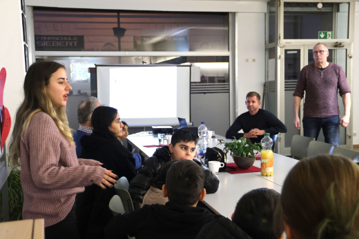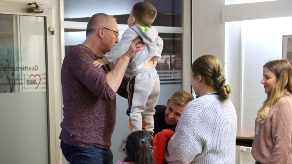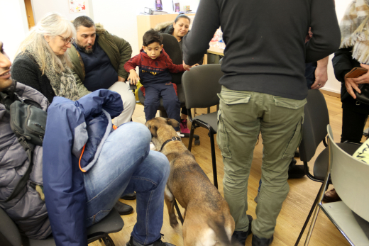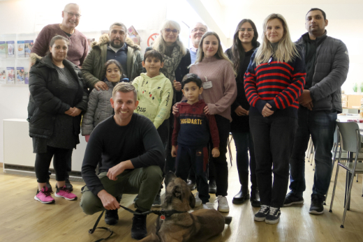 Eine Frau, die sehr viel Angst vor Hunden hat, bittet Hotte Storb nach vorne. Er macht ihr genau vor, wie sie sich verhalten kann, wenn ein Hund kommt. „Die Kinder auf gar keinen Fall hochnehmen, wenn der Hund kommt“, betont er. „Dann springt das Tier womöglich an ihnen hoch. Wenn der Hund auf das Kind zugeht, stell dich einfach vor dein Kind.“ Auch ein Vater möchte sich hier zurückversichern und fragt, was er machen soll, wenn der Hund nicht geht. Der Hundeführer rät dazu, ruhig mit dem Tier zu sprechen – egal in welcher Sprache. Apropos Sprache, bei detaillierteren Ausführungen oder wenn sich Zuhörende unsicher sind, übersetzen die AWO Mitarbeitenden kurzerhand, damit wirklich alle ihre Unsicherheiten ablegen und ihr Wissen später weitergeben können.
