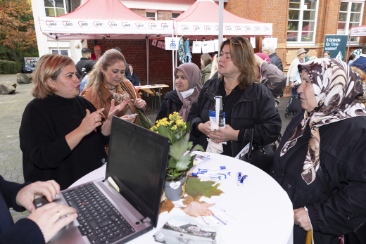 Bereits am Morgen hat Dr. Ingrid Majid von der Verbraucherzentrale NRW eine kurze Schulung für Mediator:innen durchgeführt, die ihr Wissen umgehend an Zugewanderte, Senior:innen und Geflüchtete weitergegeben haben. Außerdem stellt sie mit ihrem Team das neue Projekt „Get in!“ vor. Das Angebot richtet sich sowohl an Lehrkräfte, an Helfende in der Flüchtlingsarbeit wie auch direkt an alle neu zugewanderten Menschen, unabhängig von ihrem Aufenthaltsstatus. „Wir haben viele gute Multiplikatorengespräche geführt“, stellt Dr. Ingrid Majid am Nachmittag fest.