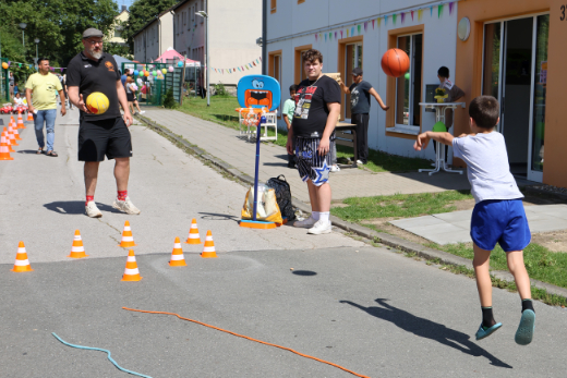 Ganz konzentriert dribbelt ein kleiner Junge den Basketball durch einen Parcours, um am Ende auf einen Korb – in Kinderhöhe angebracht – zu werfen. „Jeder, der einen Treffer landet, erhält einen kleinen Preis“, erklärt Jens Lohutta, Jugendkoordinator der Hertener Löwen, die seit einiger Zeit eine Kooperation mit dem Familienzentrum haben. Das Team möchte gerne ein regelmäßiges Vater-Kind-Angebot mit dem Ankommenszentrum etablieren und nutzt das Sommerfest, um sich zu vernetzen. „Es ist ein schönes Miteinander hier. Vor allem, dass die Menschen, die hier leben, sich aktiv am Programm beteiligen und helfen, finde ich toll. Das ist doch gelebte Integration.“