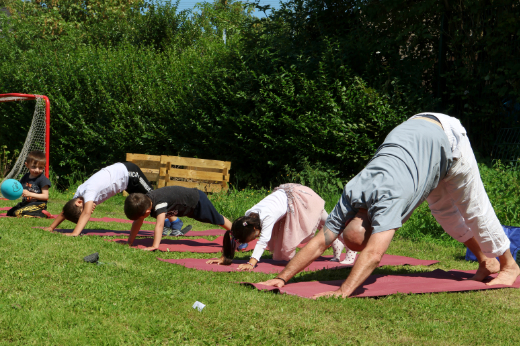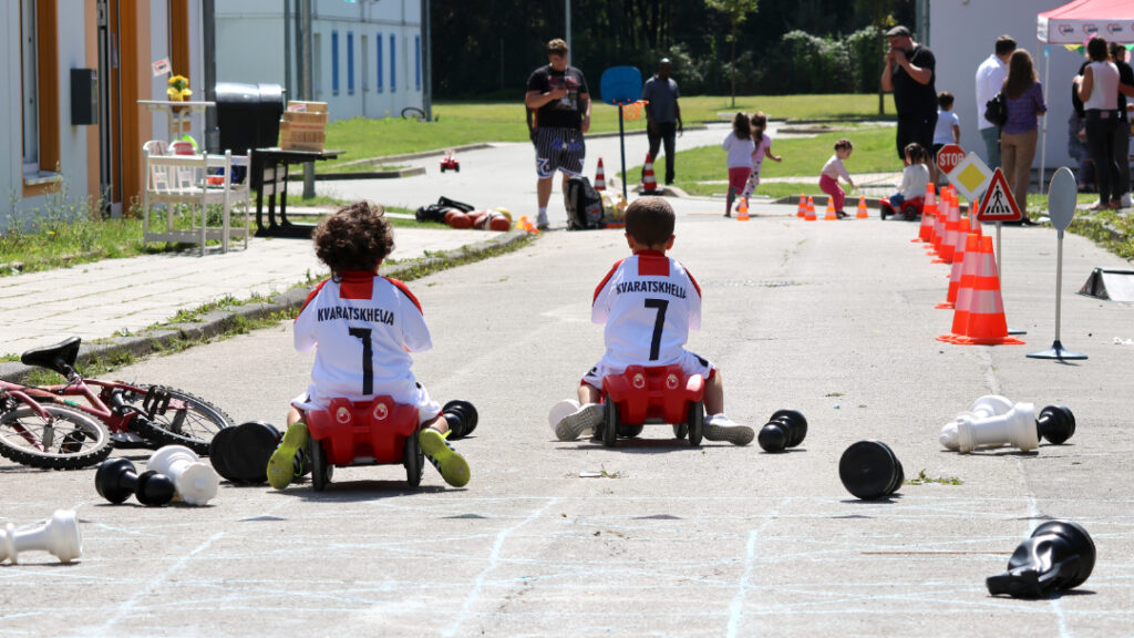 „Wir sind alle hier in der Siedlung ansässig, da macht es Sinn, sich zu vernetzen“, sagt Anja Hänel, Leitung des Familienzentrums. Es ergäben sich viele Synergien. „Der Platz hier ist ideal, da die Kinder geschützt laufen können.“ So sind unter den Gästen nicht nur Bewohner des Ankommenszentrums und Familien aus dem Familienzentrum sondern auch Nachbar:innen aus der Siedlung. Besucher:innen – egal ob klein oder groß, mit oder ohne Handycap – stehen zahlreiche Aktivitäten zur Auswahl: das DRK hat eine Hüpfburg aufgebaut, Bobbycars stehen für Rennen bereit, ein großes Schachfeld ist mit Kreide auf den Boden aufgemalt, zahlreiche Spielgeräte können ausgeliehen werden, in einer Fotobox des Jugendrings können Erinnerungsfotos geschossen werden und wer Lust hat, kann Yoga machen oder Basketball spielen.