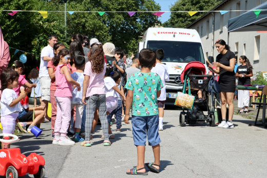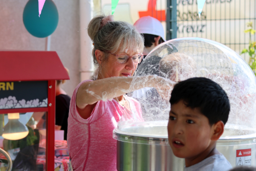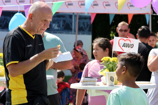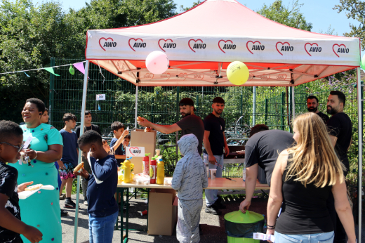 Es duftet nach frisch gebackenen Waffeln und gegrillten Würstchen. Aus einer Ecke sind Trommeln und Gitarrenklänge zu hören. Der ganze Platz ist erfüllt von einem fröhlichen Gezwitscher der Jungen und Mädchen, Eltern und Großeltern, Nachbarinnen und Nachbarn, die spielen, miteinander reden und eine schöne Zeit haben. Beim Sommerfest auf dem Gelände des AWO Ankommenszentrum können sie alle für ein paar Stunden ihre Sorgen vergessen und einfach nur das Angebot und den strahlenden Sonnenschein genießen. Organisiert wurde das Fest vom interkulturellen Team des Ankommenszentrums in Kooperation mit dem Familienzentrum Brückenstraße und dem AWO Gemeinschafthaus.