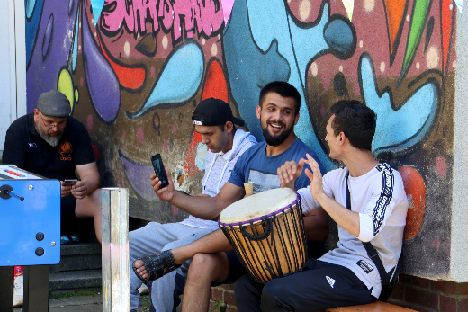 Für die Bewohner:innen des Ankommenszentrum war es gar keine Frage zu helfen. „Unsere Bewohner:innen haben gebacken, beim Aufbau geholfen und sind jetzt auch noch am Grill im Einsatz“, sagt Tatjana Chochlunow, Leitung des AWO Ankommenszentrums. „Es ist schön zu sehen, wie viel Freude sie an solchen Aktionen haben.“ Das findet auch Lena Uppenkamp vom Referat 47 der Stadt Gelsenkirchen: „Es ist sehr einladend und alle sind sehr offen.“ Ein Mädchen nahm sie einfach an die Hand und nun haben beide ein abwaschbares Tattoo auf dem Arm. Neben den geplanten Aktivitäten – wie einem kleinen Yogakurs, an dem die Kinder sehr viel Spaß haben – entsteht manches auch spontan. So hat eine Gruppe dreier junger Männer eine Bongo Trommel mitgebracht. Sich selbst nicht so ernst nehmend, machen sie Musik und singen dazu. Einige Zeit später jammt der Trommler mit Michael Kapteinat, Leiter des AWO Gemeinschaftshaus, der seine Gitarre mit auf die Wiese gebracht hat.