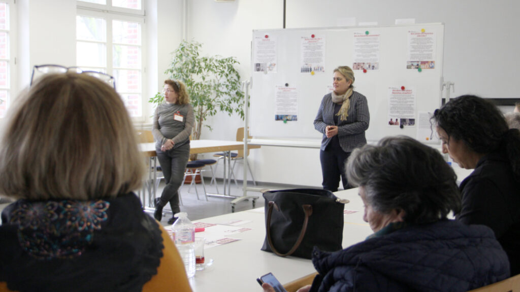 Die AWO-Mitarbeiter:innen Yasemin Akkoc (li.) und Hüriyet Yilmaz im Gespräch mit den Teilnehmenden.