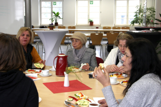 AWO-Mitarbeiterin Hüriyet Yilmaz stellt zunächst die AWO und das Projekt MBE vor. Eine Besucherin stellt dabei erstaunt fest, dass sie zwar schon seit 30 Jahren in Deutschland lebt, aber erst vor einem Jahr von der AWO erfahren hat. Nicht alle, die sich im Saal der AWO Paulstraße zum Begegnungsfrühstück getroffen haben, haben persönliche Erfahrungen mit Rassismus. Aber davon gehört, haben sie alle. So berichtet eine Dame von einem Erlebnis, das schon lange zurück liegt. „Ich wurde für eine Russin gehalten und freundlich willkommen geheißen“, erinnert sie sich an die Situation 2014. „Als man mich aber beim Gebet mit Kopftuch gesehen hat, wurde ich von allen diskriminiert. Am Ende bin ich dort weggezogen.“