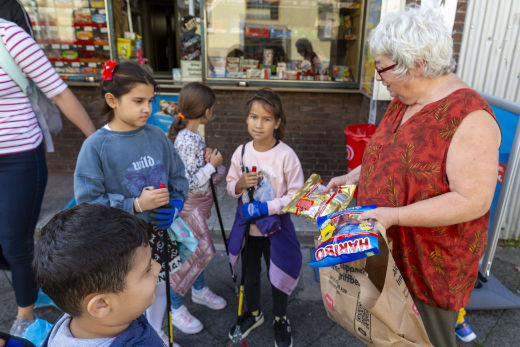 Das dies gut gelingt, zeigt sich schnell. Die bunten Teams streifen gut gelaunt durch die Straßen und finden allerhand Unrat, den sie in den Müllsäcken verschwinden lassen. Auf ihrem Weg werden sie immer wieder von Anwohner:innen angesprochen, die die Aktion super finden. Einige Ältere zeigen vom Balkon aus den Daumen hoch, andere sprechen die Engagierten direkt an. Sie wollen wissen, worum es sich bei der Aktion handelt, und zeigen Interesse, beim nächsten Mal selbst mitzumachen. Ein Kioskbesitzer läuft direkt los, um seinen Besen zu holen und fragt, wo er mit anpacken kann. Jungen und Mädchen machen aus dem Sammeln ein Spiel und krabbeln sogar zwischen die Büsche, um alles zu finden. Manche machen daraus einen regelrechten Wettkampf und versuchen schneller als die anderen etwas aufzusammeln. Eine Dame ist so begeistert – vor allem vom Engagement der Jüngeren – dass sie losgeht und als Dankeschön mit einigen Tüten Bonbons für die fleißigen Helfer:innen zurückkommt. An diesem Tag ist das Thema Müll in Bismarck kein trennendes, sondern ein verbindendes Thema.