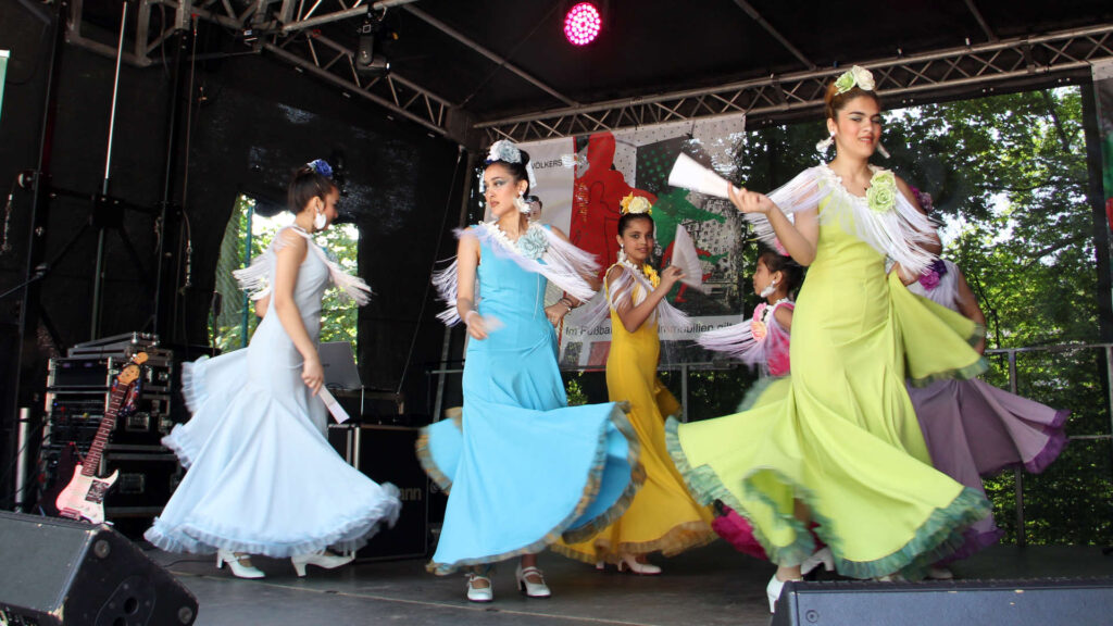 Während auf den Fußballplätzen das C-Jugend-Turnier „Kick der Kulturen“ stattfindet, bereiten sich junge Tänzerinnen auf ihren Auftritt vor. In ihren strahlend bunten Kleidern funkeln sie mit dem blauen Himmel und der Sonne um die Wette. An langen Tischreihen sitzend oder vor der Bühne stehend genießen die zahlreichen Besucher:innen das bunte Bühnenprogramm, das aus Tänzen und verschiedenen musikalischen Einlagen besteht.