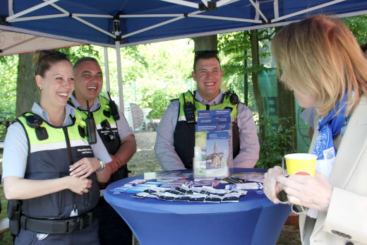 Oberbürgermeisterin Karin Welge plaudert entspannt mit den Mitarbeitern des Kommunalen Ordnungsdienstes (KOD).
