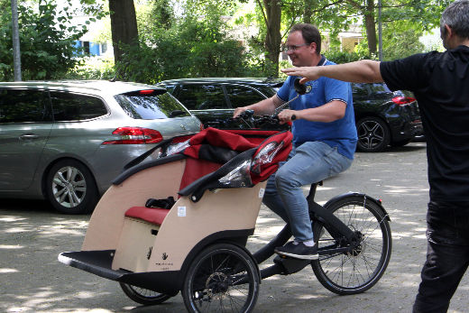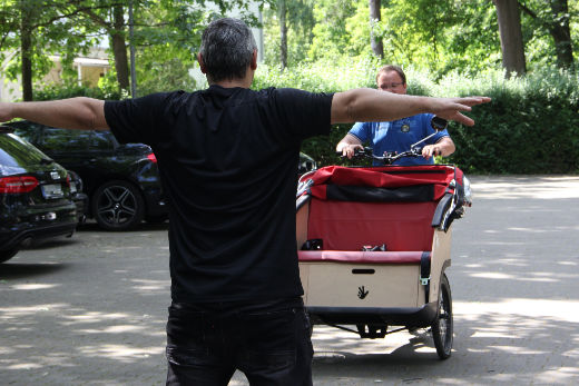 Übung macht den Meister: Julian Kassautzki absolviert zunächst eine „leere“ Testfahrt und übt dabei seinem AWO-Kollegen Khalaf Alhabib auszuweichen. Denn, Kurvenfahren mit der Rikscha verlangt Feingefühl. Bei der anschließenden Runde stellen sich