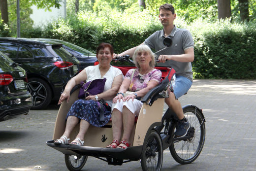 Julian Kassautzki und Khalaf Alhabib. In der Rikscha: Irmi Jung (l.) und Karin Polak von der AWO-Bingogruppe.
